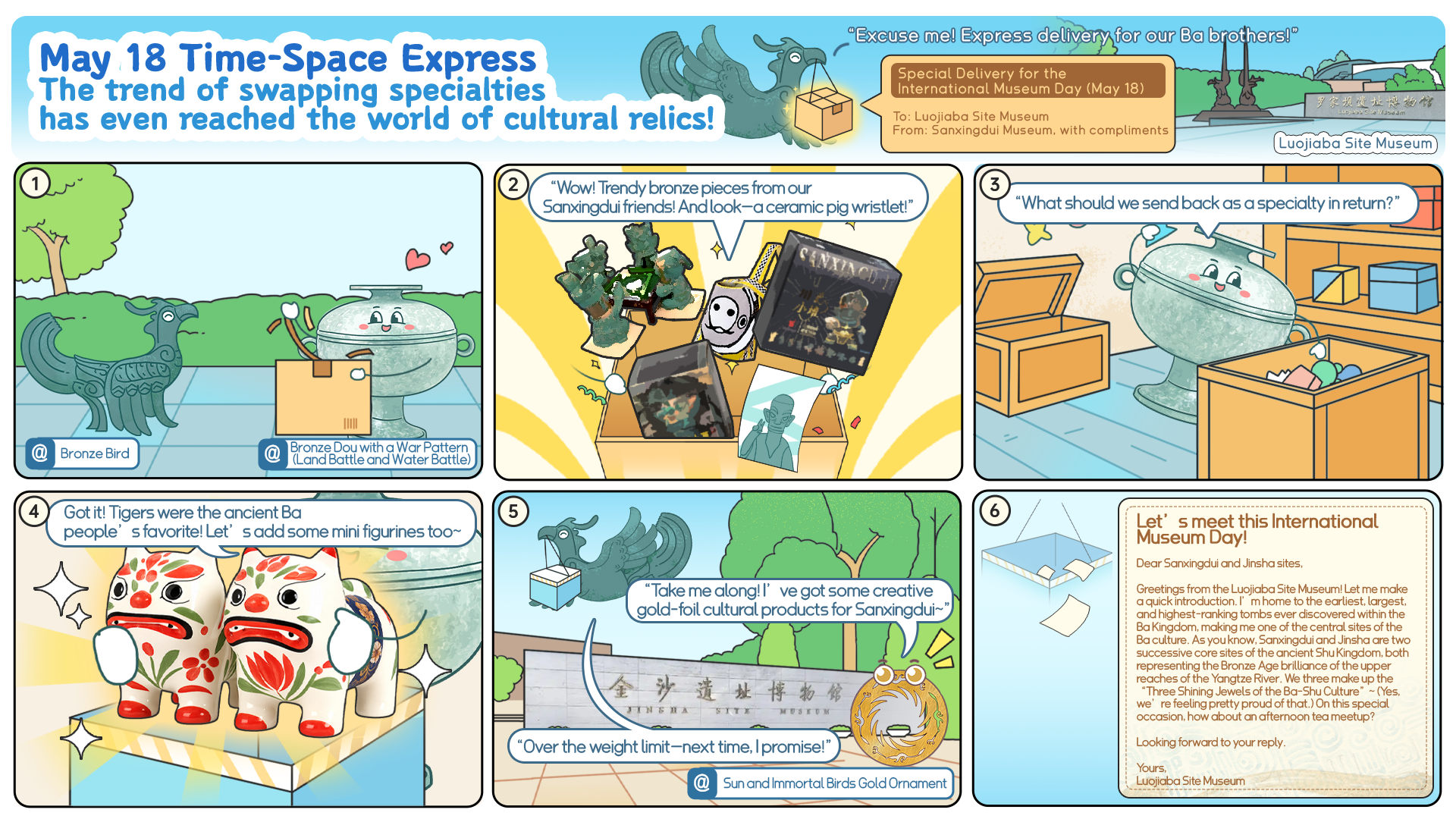 في هذا اليوم المميز، أرسل “الطائر البرونزي” في متحف سانشينغدوي المنتج الثقافي والإبداعي البرونزي وحقيبة يد لطيفة على شكل خنزير فخاري، كقطعة فنية محلية، إلى “دو البرونزي بنمط حرب (معركة برية ومعركة مائية)” في متحف موقع لويابا. وردّ “دو البرونزي” بتمثال نمرٍ كان محبوبًا لدى شعب با. وهكذا بدأ هذا “التبادل المحلي المتخصص” للآثار الثقافية. كما استجاب متحف الشمس والطائر الخالد في موقع جينشا، وتبرع بتذكاراتٍ مغلفة بورق الذهب إلى سانشينغدوي، إلا أن الطرود لم تصل بسبب “وزنها الزائد”.