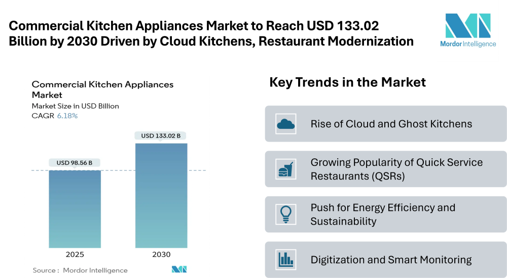The commercial kitchen appliances market is poised to expand from USD 98.56 billion in 2025 to USD 133.02 billion by 2030, growing at a compound annual growth rate (CAGR) of 6.18%. This growth is being driven by the rising number of food service establishments, the rise of cloud and ghost kitchens, and increasing consumer demand for faster, quality food service across various formats.