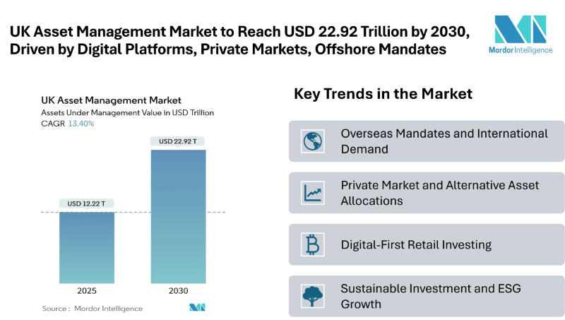 The UK Asset Management Market is projected to grow from USD 12.22 trillion in 2025 to USD 22.92 trillion by 2030, registering a CAGR of 13.40%. This growth underscores the expanding UK asset management market share and reinforces its role as a key pillar of the financial services sector.