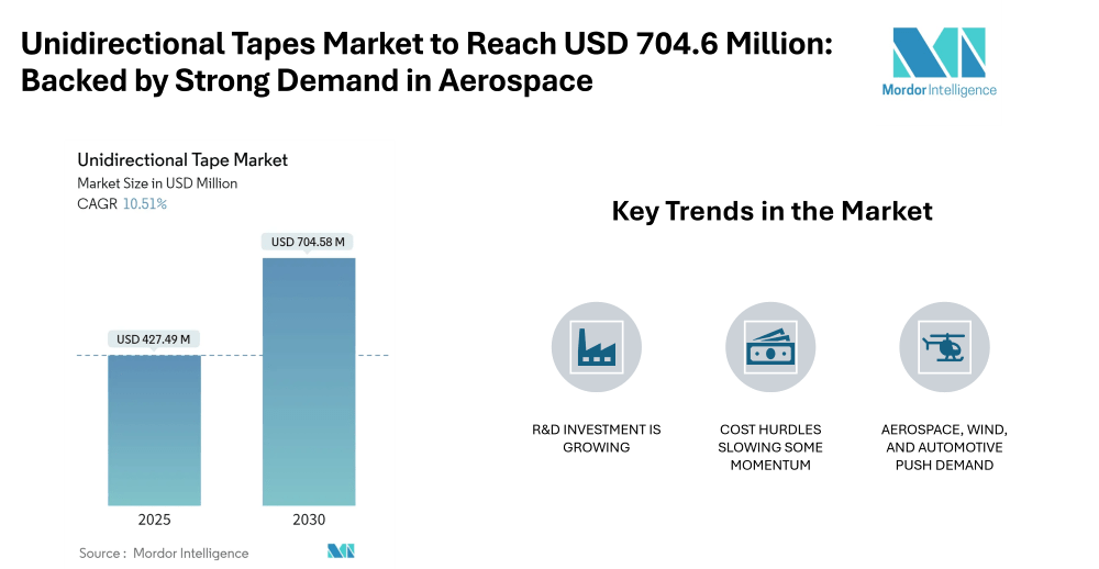 From about USD 427.5 million in 2025, the unidirectional tapes market is expected to climb to roughly USD 704.6 million by 2030, at a healthy projected CAGR of 10.51 percent.