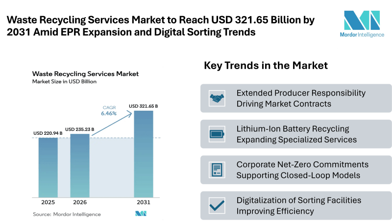 According to Mordor Intelligence, the waste recycling services market size was valued at USD 220.94 billion in 2025 and is estimated at USD 235.23 billion in 2026, projected to reach USD 321.65 billion by 2031, registering a CAGR of 6.46%. This market growth reflects tightening Extended Producer Responsibility frameworks, increased corporate sustainability commitments, and modernization of sorting and processing infrastructure.